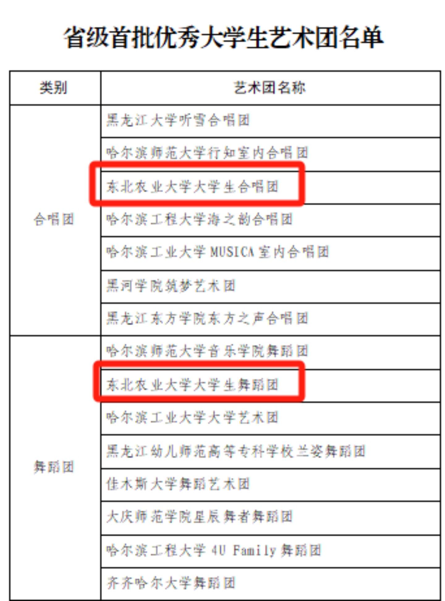 根据《黑龙江省教育厅关于遴选建设首批优秀学生艺术团的通知》要求,经学校自主申报、各市(地)教育局遴选推荐,省级专家团队现场评审,共遴选70个优秀学生艺术团,其中,优秀大学生艺术团20个,包括:合唱团7个、舞蹈团8个、学生乐团4个、戏剧戏曲团1个。