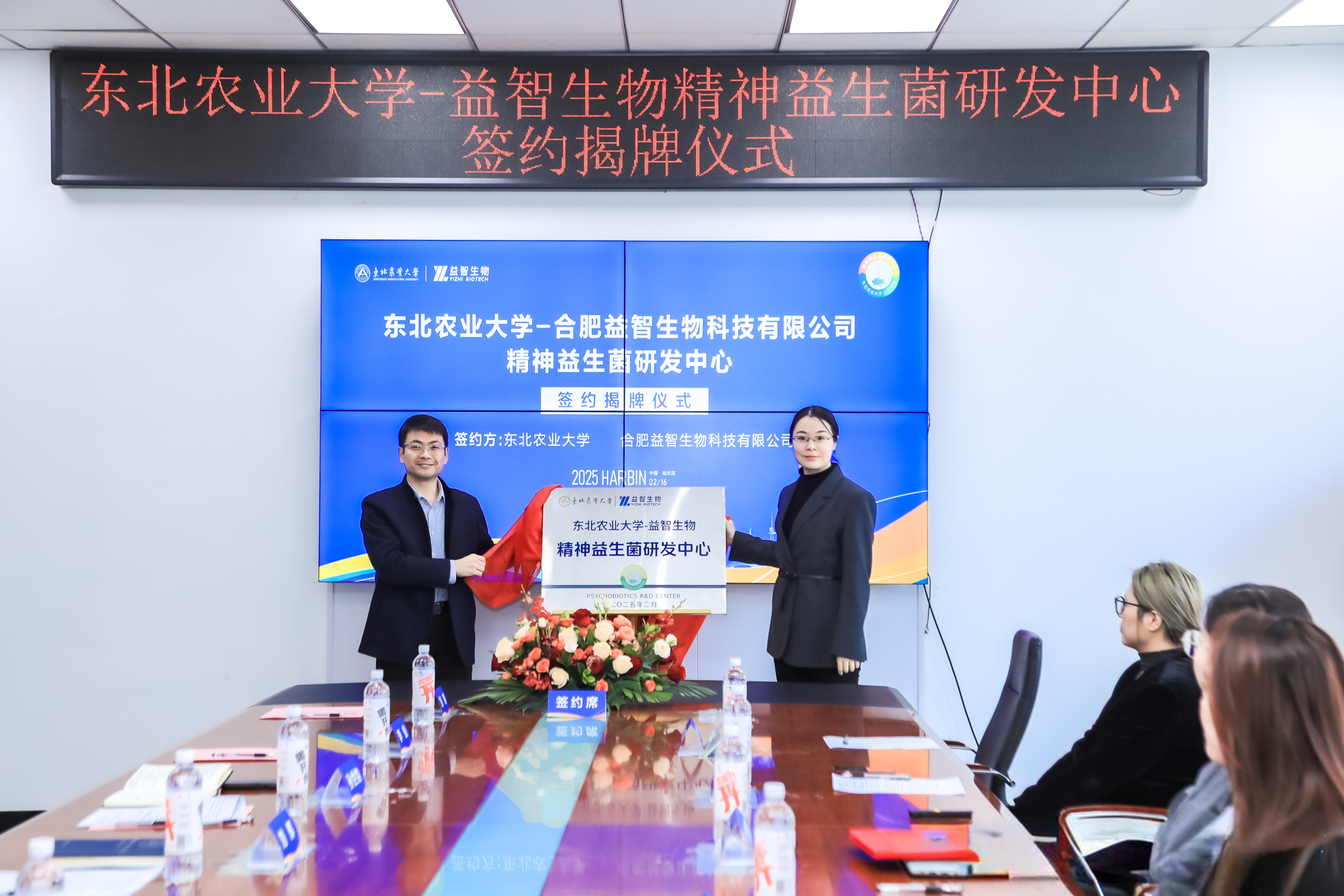 孙世钧、王娴分别代表学校及合肥益智生物科技有限公司共同为“东北农业大学益智生物精神益生菌研发中心”揭牌。