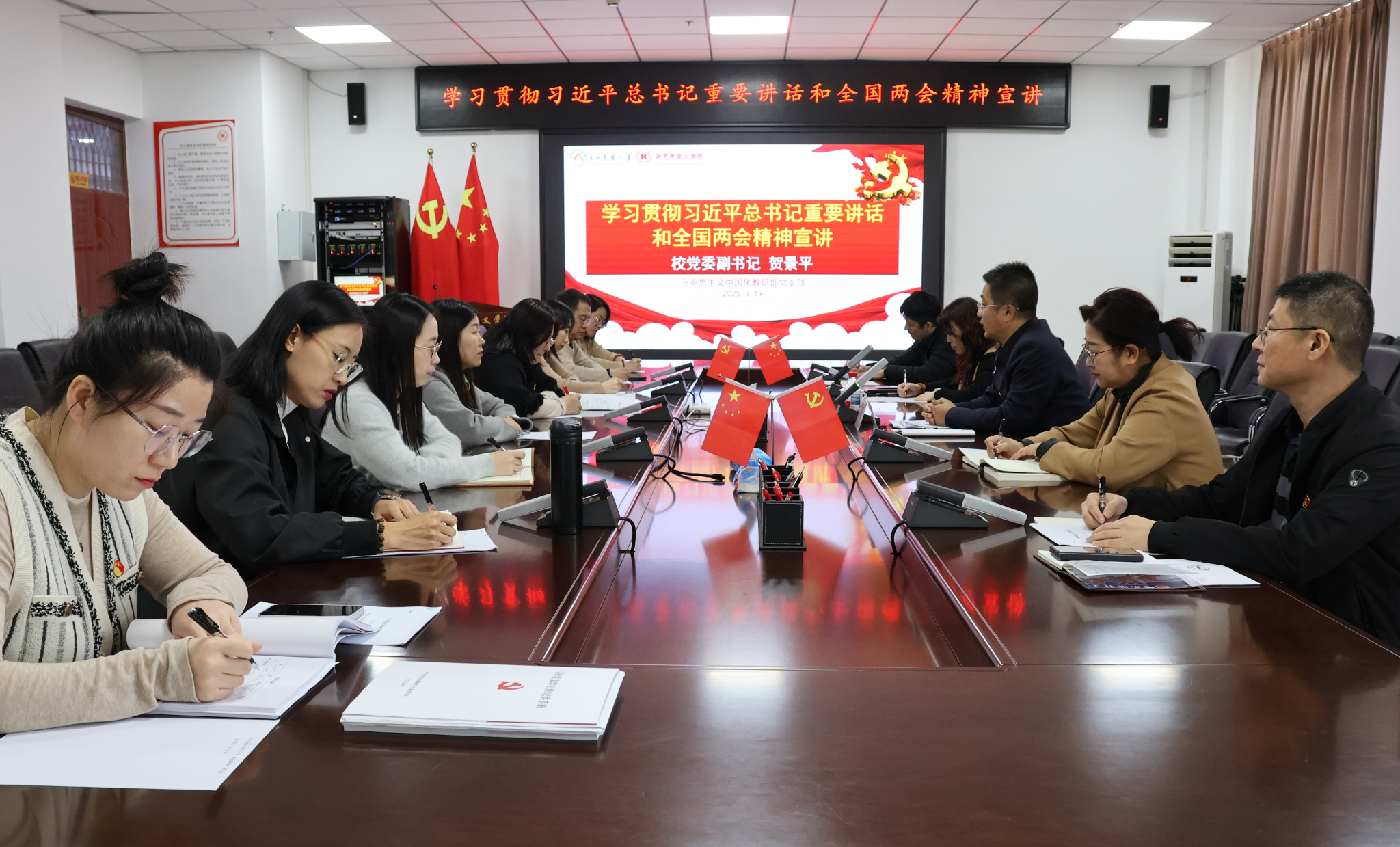 为进一步贯彻落实习近平新时代中国特色社会主义思想,深入学习宣传全国两会精神和学校第四次党代会精神,3月19日,校党委副书记贺景平深入马克思主义学院马克思主义中国化教研部党支部,宣讲全国两会精神和学校第四次党代会精神。党支部全体党员参加会议。