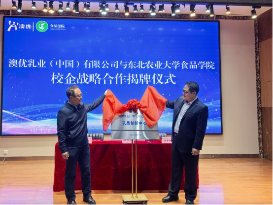姜毓君、李威共同为“澳优乳业东北农业大学乳品创新中心”揭牌。