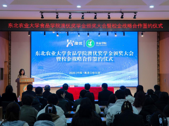 随后进行澳优奖学金颁奖大会。刘骞宣读了《关于颁发东北农业大学食品学院“澳优奖学金”的决定》。