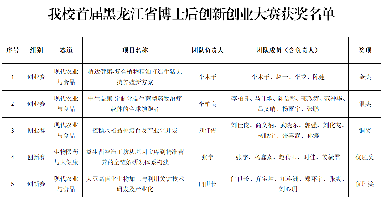 7月30日,黑龙江省人力资源和社会保障厅公布了首届黑龙江省博士后创新创业大赛获奖结果,我校5支参赛团队分获金奖1项、银奖1项、铜奖1项、优胜奖2项。同时,我校获得优秀组织奖,获奖数量及层次位居全省参赛单位前列。