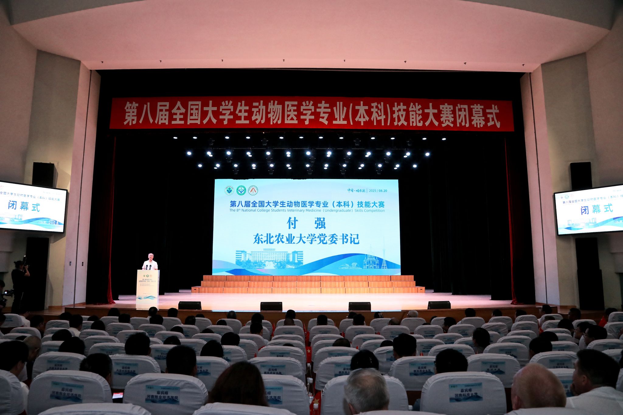 张国中在总结发言中向东北农业大学、裁判员、赞助企业和全体参赛选手致以衷心感谢。他指出,大赛充分展现了各高校实践教学与人才培养的显著进步,体现了新时代兽医人才的优秀素养。他强调,大赛为深化产教融合、推动教学改革提供了重要契机,未来应进一步加强校企协同,促进赛教深度融合,共同培养符合行业发展需要的高素质兽医人才。他勉励学子将大赛经验转化为专业成长动力,在动物医疗和公共卫生领域追求卓越、贡献力量。