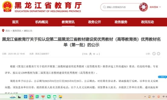 近日,黑龙江省教育厅公示第二届教材建设奖优秀教材(高等教育类)第一批评选结果。经各高校申报、专家严格评审,共评选出129部获奖教材。我校共有12部教材成功入选,获奖总数位列全省高校第二。其中,一等奖2部、二等奖10部,另有2部教材凭借突出优势被推荐参评国家级优秀教材。本次获奖成果,是我校长期坚持以教学为中心、高度重视教学资源建设的集中体现。