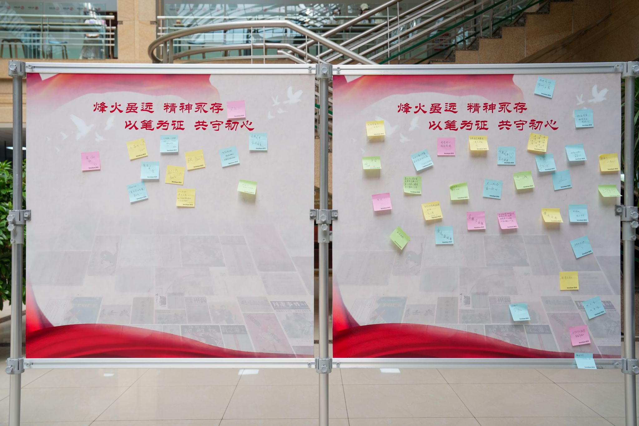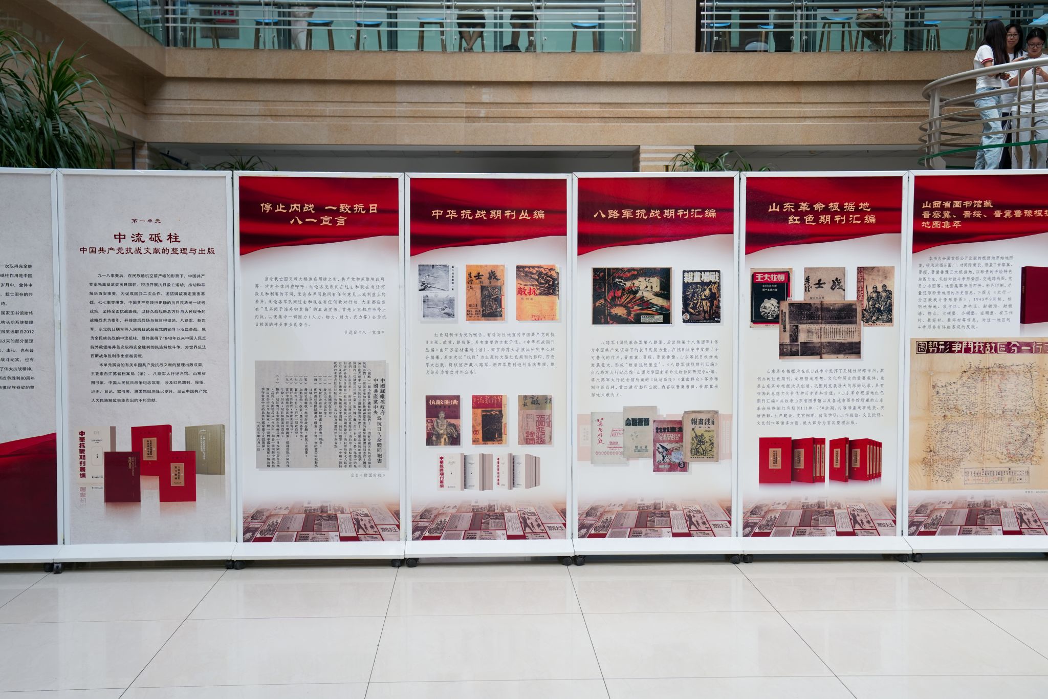 本次展览以线上、线下两种形式,集中展示了国家图书馆“革命文献与民国时期文献保护计划”的重要成果,分为“中流砥柱——中国共产党抗战文献的整理与出版”“同仇敌忾——全民族抗战文献的整理与出版”“铁证如山——日本侵华罪行文献的整理与出版”“历史审判——对日战犯审判文献的整理与出版”,内容涵盖中国共产党宣言、战士家书、抗战纪实、文艺作品等,展现中国共产党的中流砥柱作用和伟大抗战精神,是铭记历史、传承精神的生动载体。展览将在图书馆二楼大厅持续展出三周。现场还设置有留言板,供师生留下观展感悟。