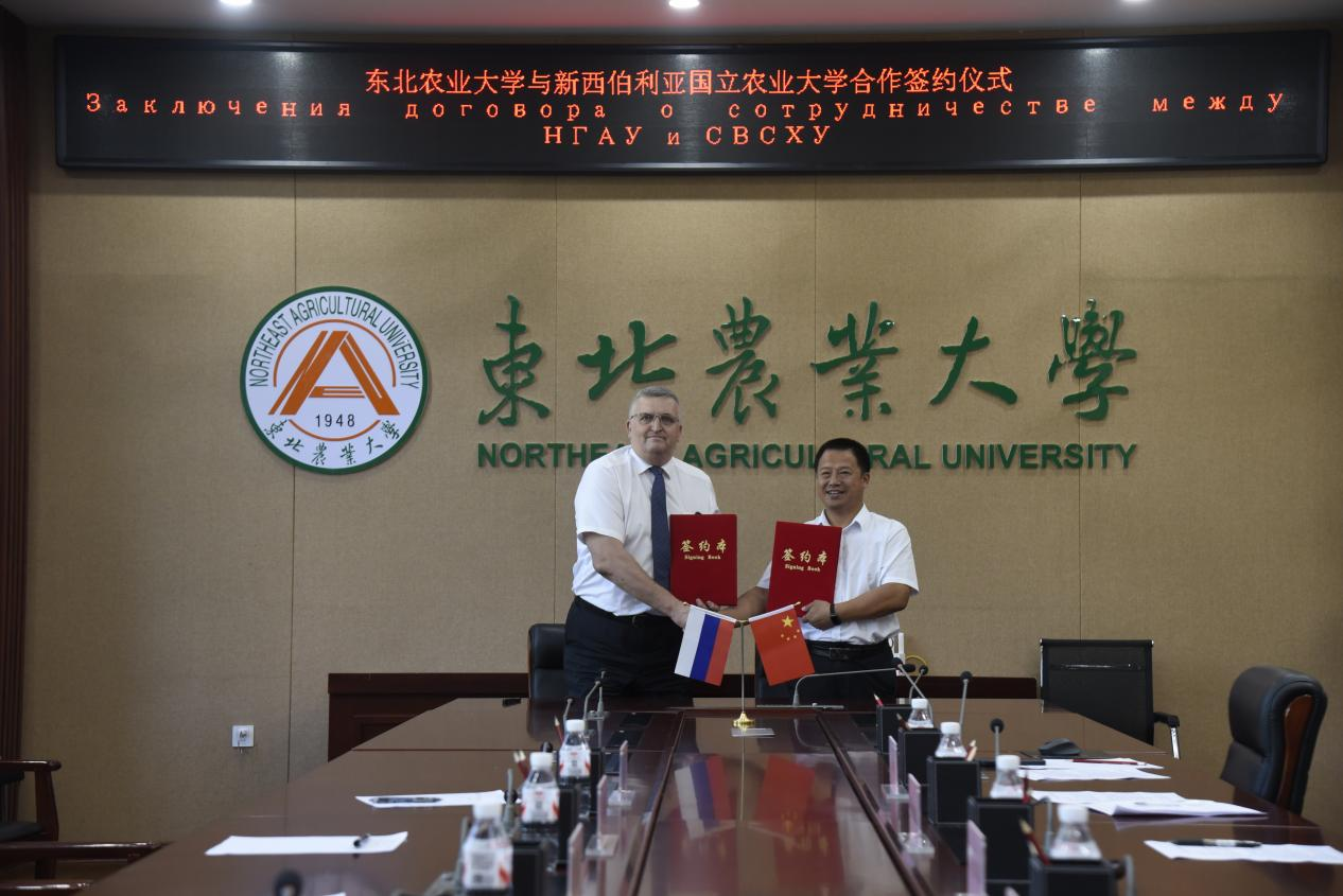 陈庆山与巴宾共同签署《东北农业大学与新西伯利亚国立农业大学共建中俄功能性益生菌创新联合实验室合作协议》。