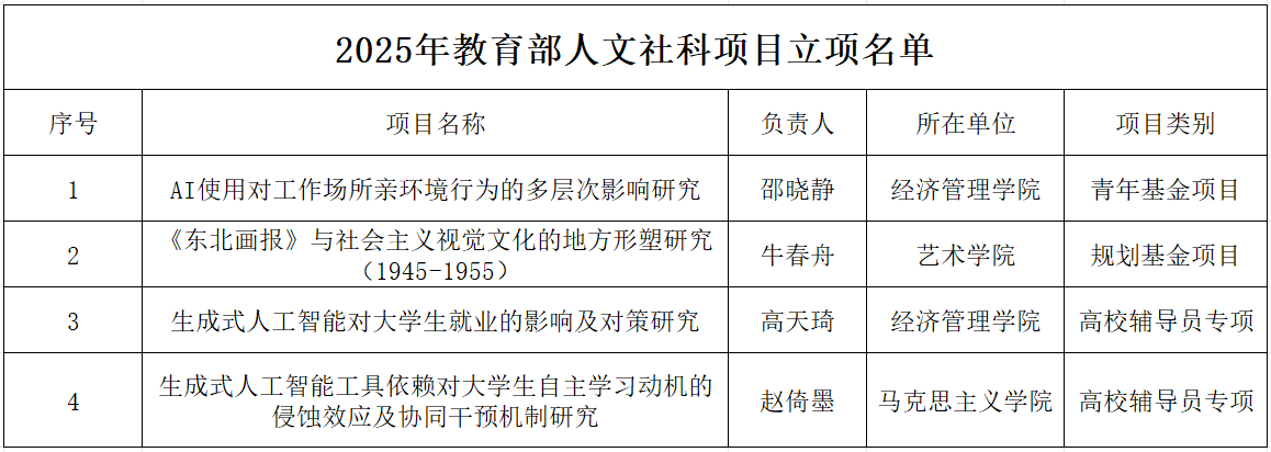 近日,教育部社会科学司公布了2025年度教育部人文社会科学研究一般项目立项名单,我校共有4个项目获得立项,其中规划基金项目1项、青年基金项目1项、高校辅导员研究专项项目2项。立项数量位于全省高校第3位,高校辅导员研究专项立项数位于全省高校及全国农业高校第1位,取得历史性突破。
