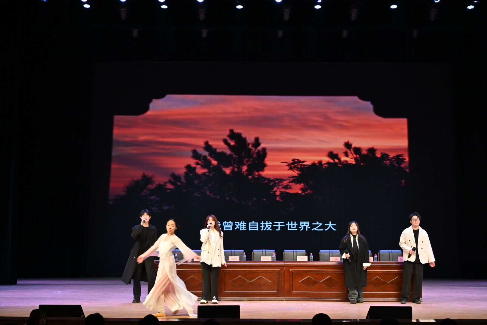 大会开始前,管法学院“十佳歌手”带来了暖场歌曲《追光者》《交换余生》、歌舞《起风了》和辅导员徐日彤、于明慧、王琦带来了歌曲《你曾是少年》,展现出了管法学子无惧困难、直面挑战的卓越品质。