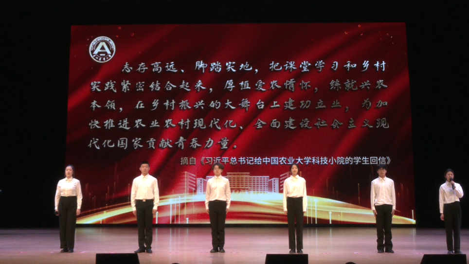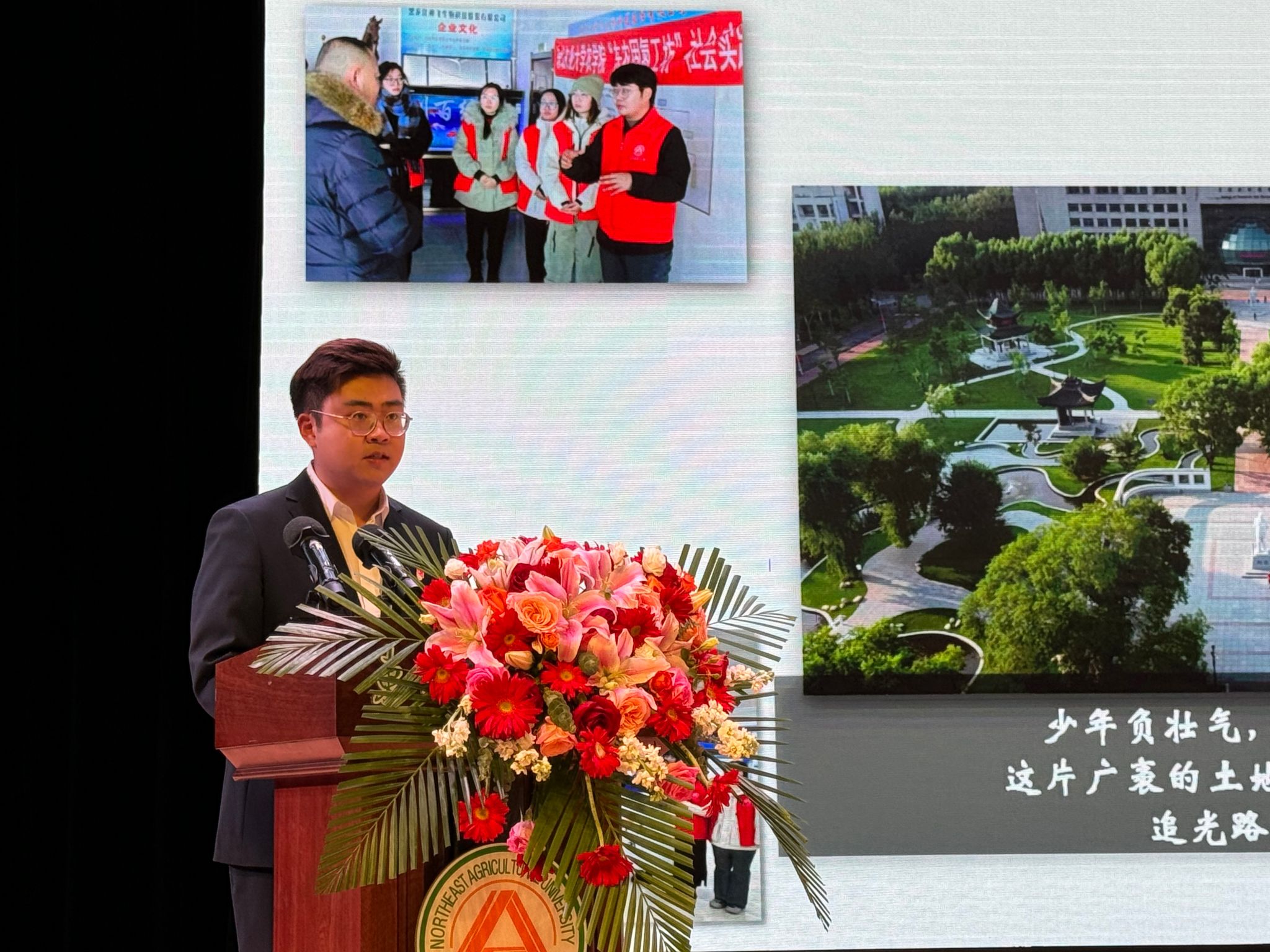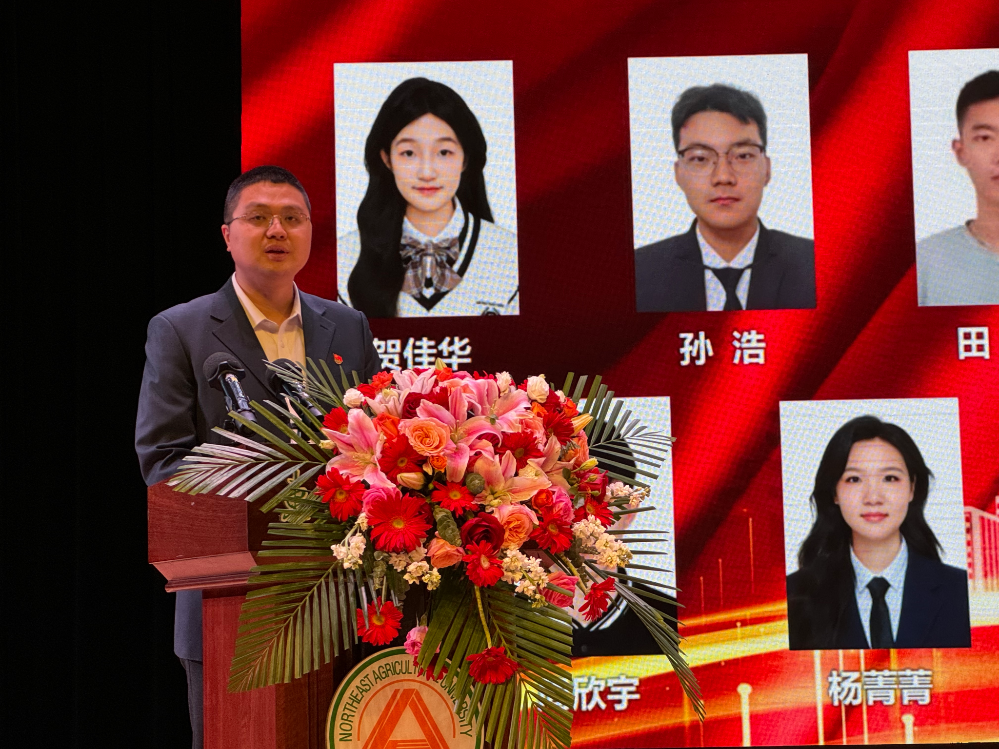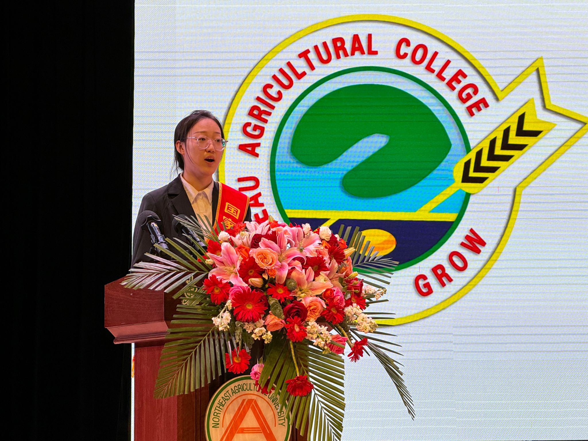 学生代表刘洋嵘珈、靳松、于童、姜苏桓发言,他们从科研、实践、创新等方面进行了经验分享,表示作为新时代农学学子,要砥砺深耕、学农爱农、在奉献三农中践行人生理想,在矢志奋斗中谱写农学学子的青春之歌。