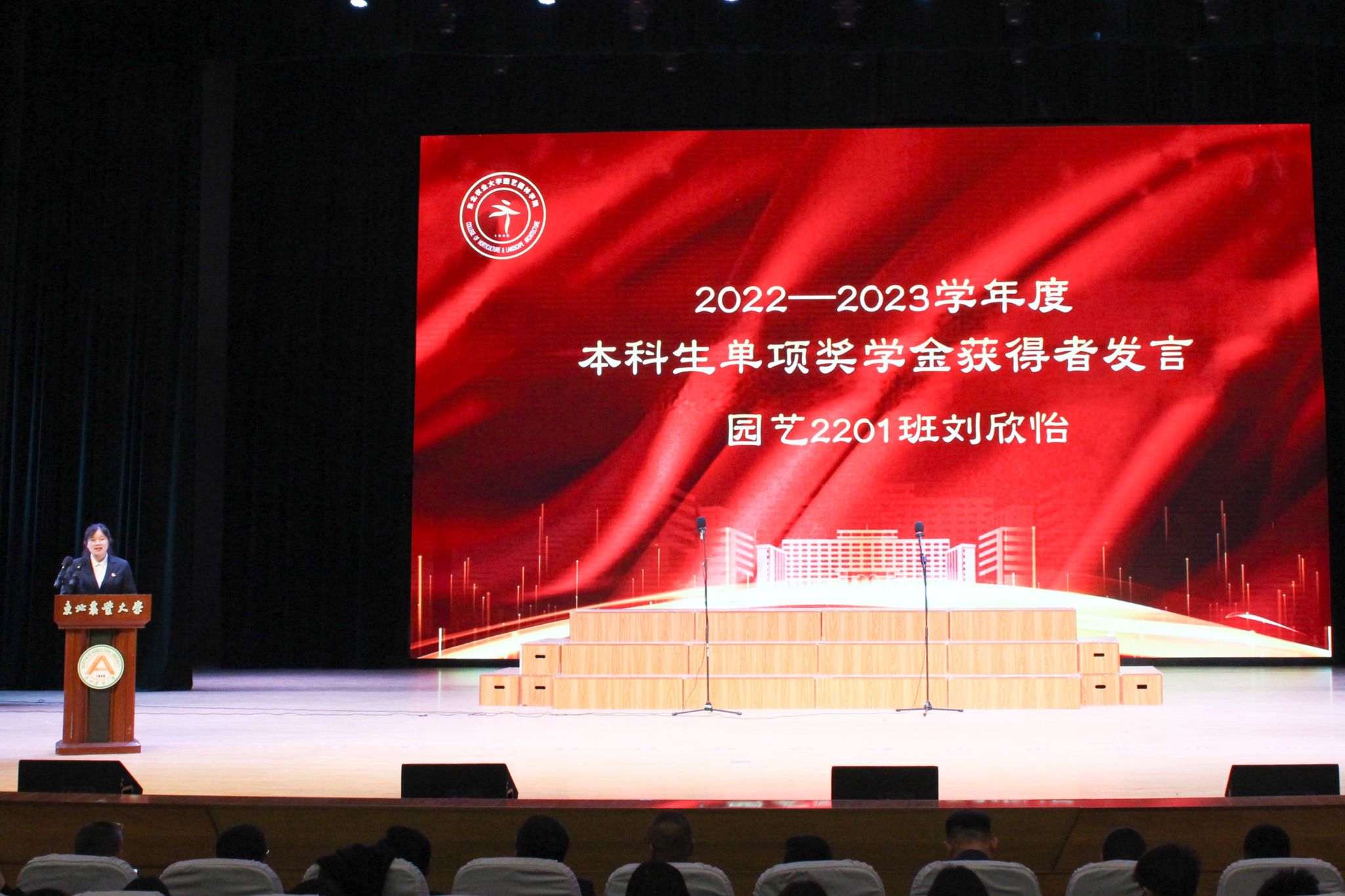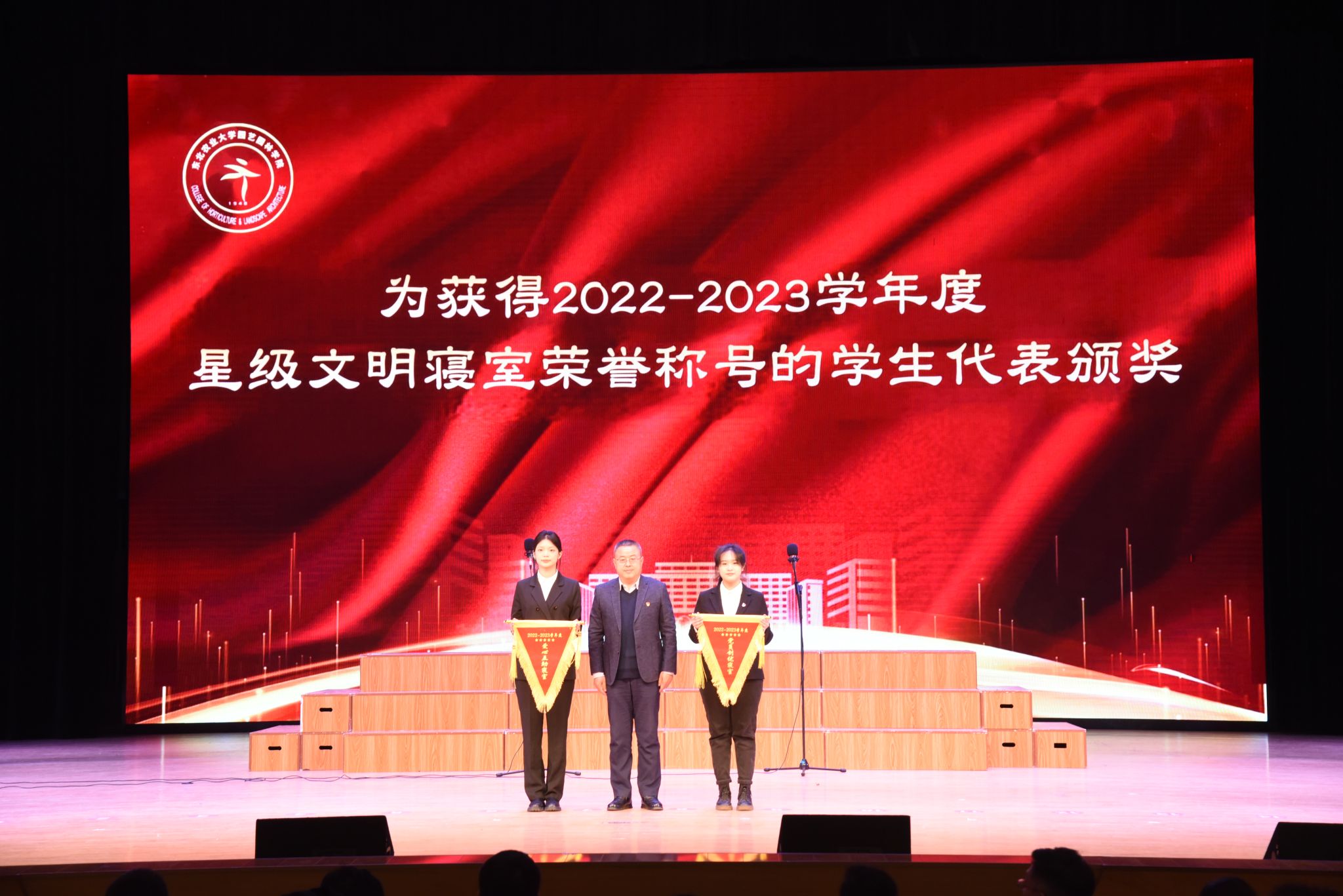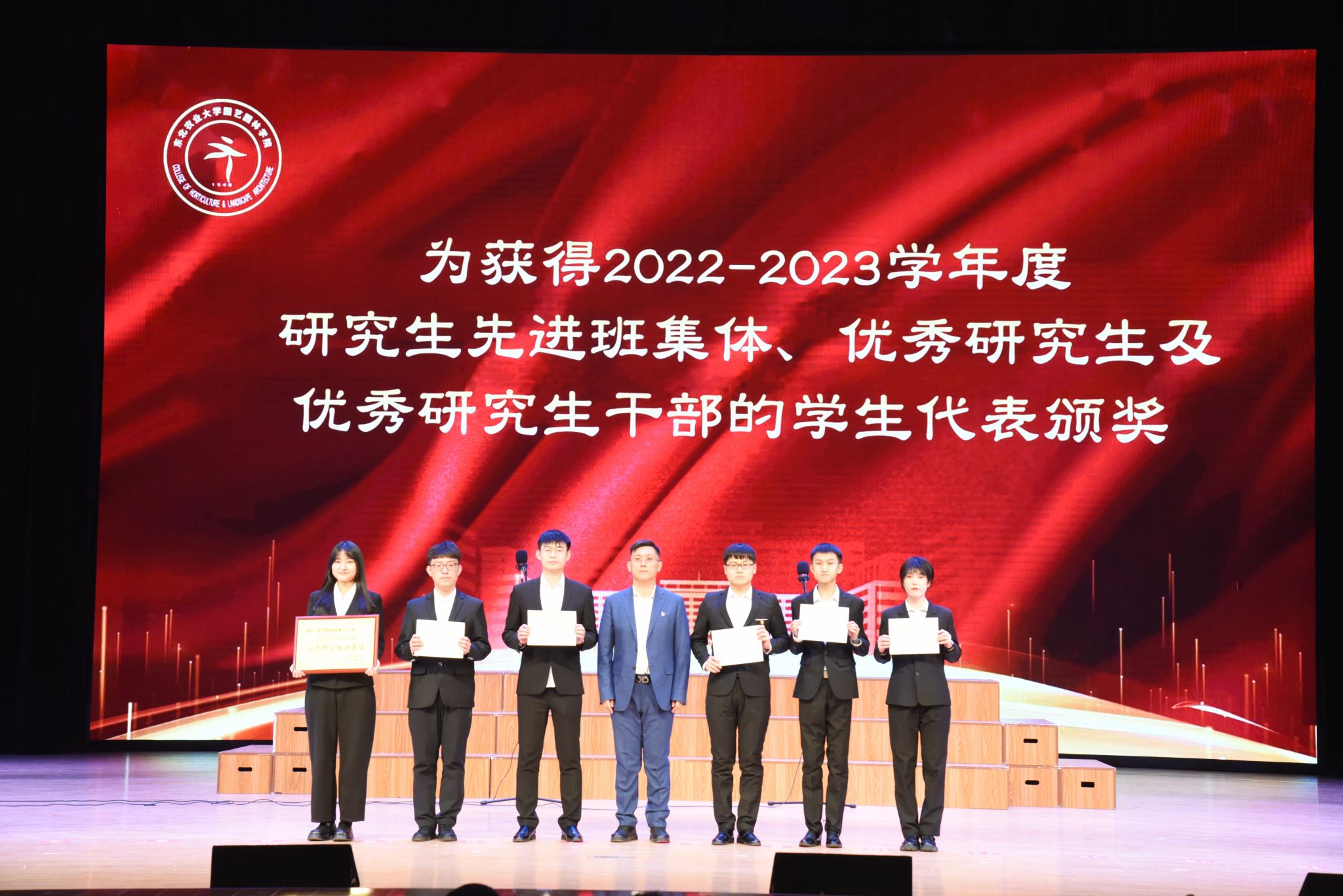 于兴业宣读了《关于颁发2023年研究生国家奖学金的决定》,刘双奇宣读了《关于颁发2022—2023学年度本科生国家奖学金、国家励志奖学金的决定》,学院党委书记程国林宣读了《关于表彰2023年黑龙江省普通高等学校“三好学生”的决定》,院长王傲雪宣读了《关于颁发2022—2023学年度本科生单项奖学金的决定》,副院长马鸿艳宣读了《关于表彰2022—2023学年度本科生先进班集体、大学生年度人物的决定》,副院长秦栋宣读了《关于表彰2022—2023学年度星级文明寝室的决定》,副处级辅导员王勇宣读了《关于表彰2022-2023学年度研究生先进班集体、优秀研究生、优秀研究生干部的决定》,与会领导分别为获奖代表颁奖。颁奖环节结束,园艺学子共同合唱《未来我来》。