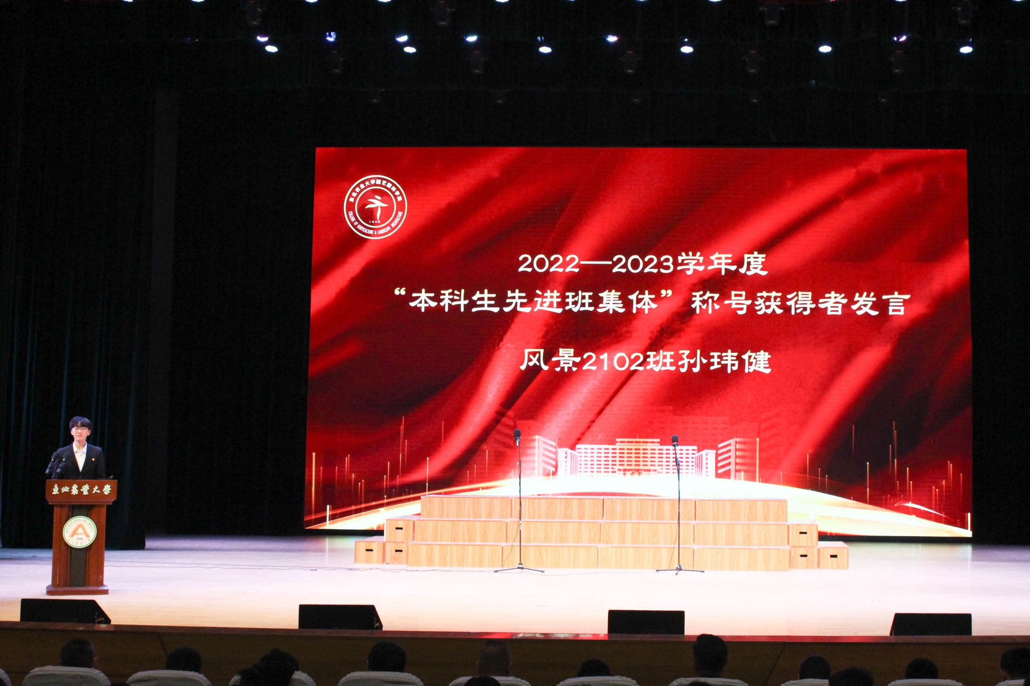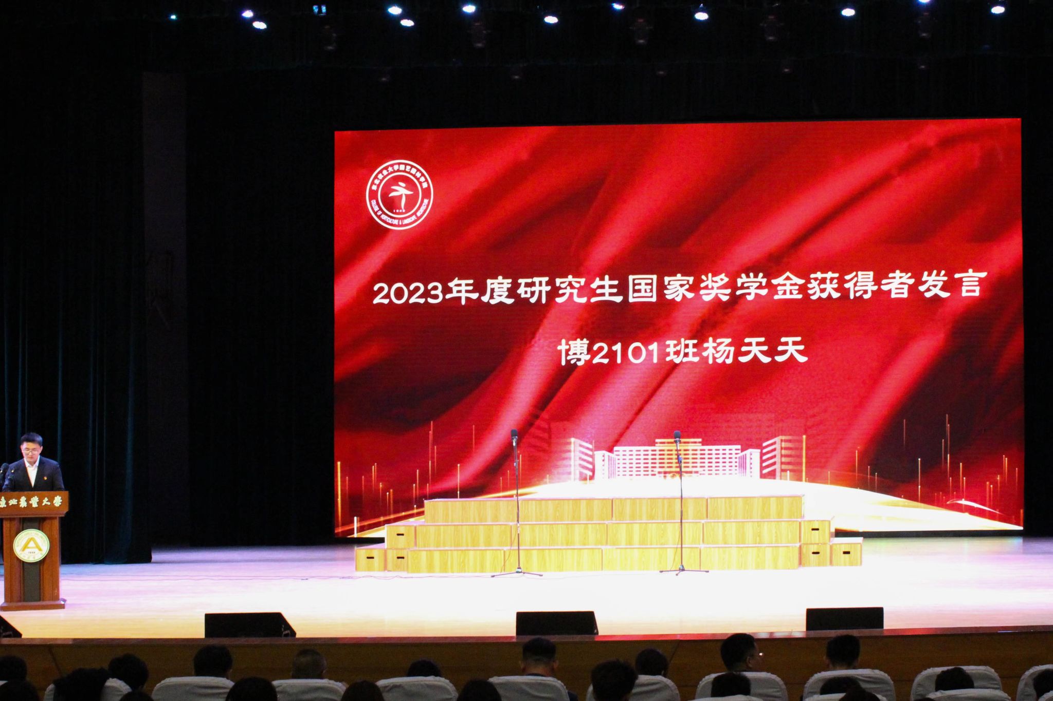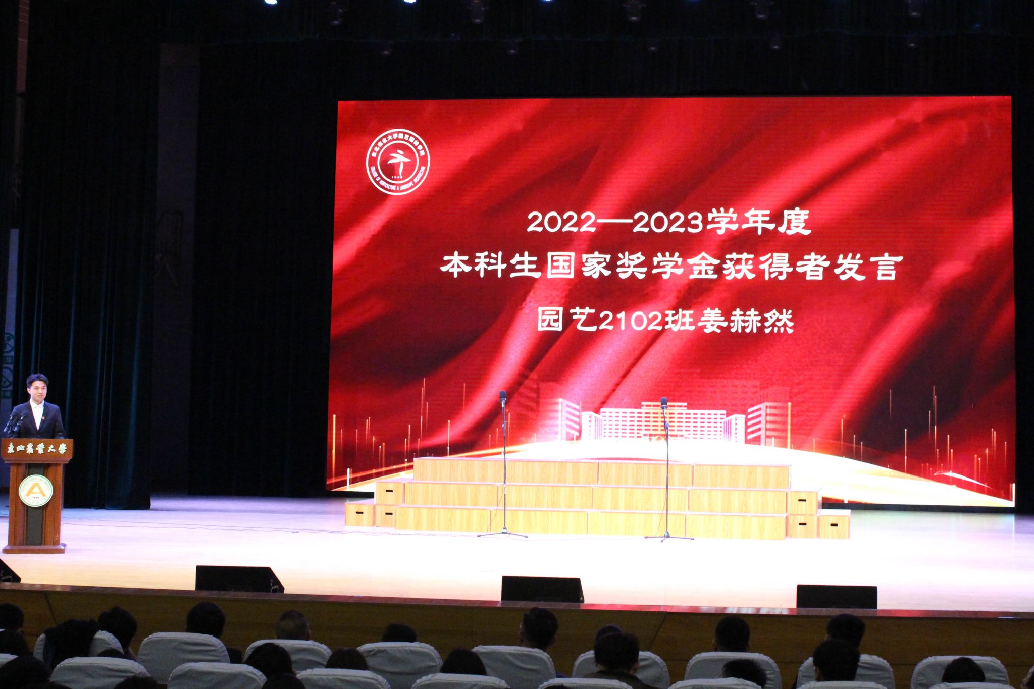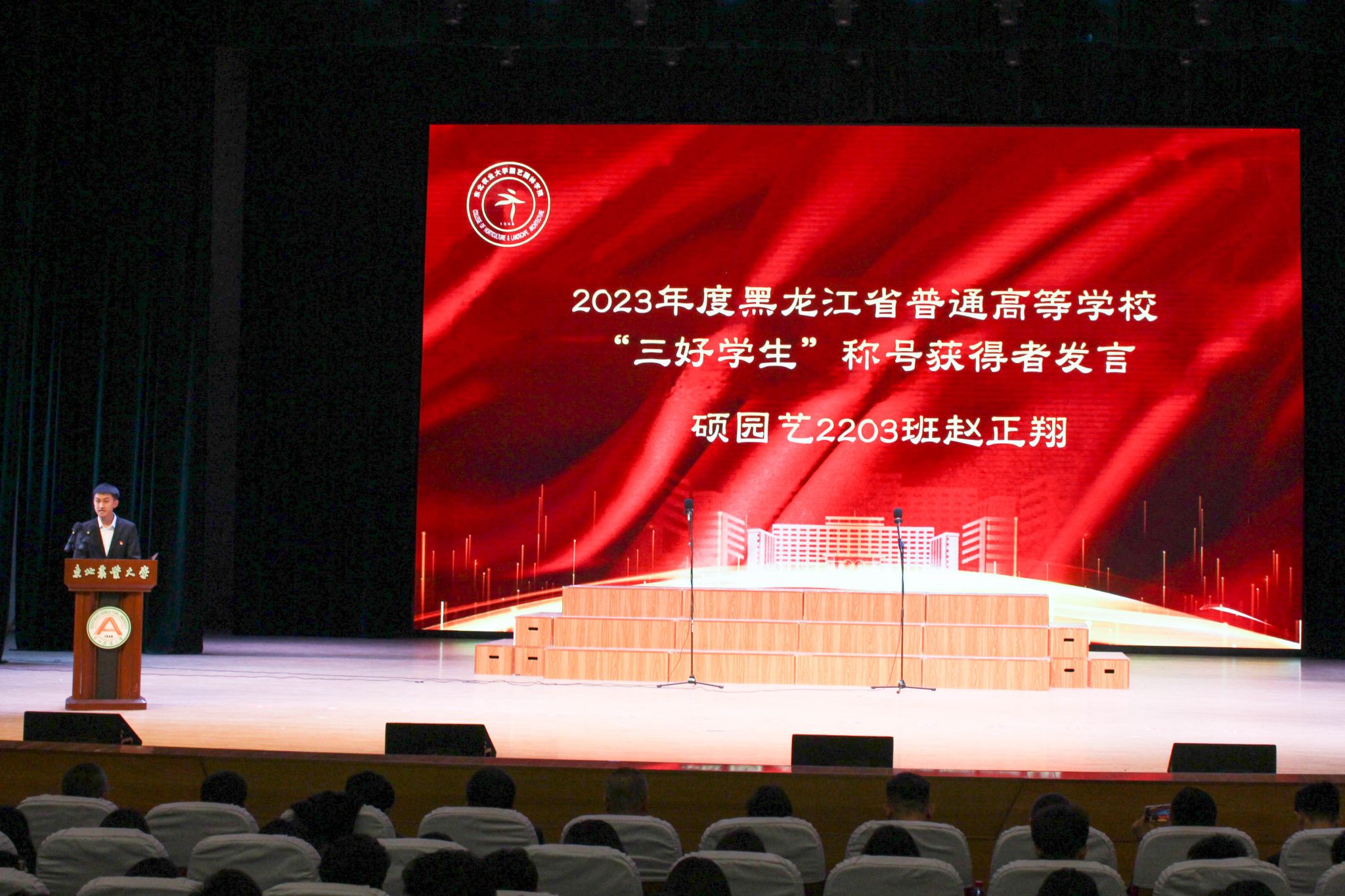 于兴业宣读了《关于颁发2023年研究生国家奖学金的决定》,刘双奇宣读了《关于颁发2022—2023学年度本科生国家奖学金、国家励志奖学金的决定》,学院党委书记程国林宣读了《关于表彰2023年黑龙江省普通高等学校“三好学生”的决定》,院长王傲雪宣读了《关于颁发2022—2023学年度本科生单项奖学金的决定》,副院长马鸿艳宣读了《关于表彰2022—2023学年度本科生先进班集体、大学生年度人物的决定》,副院长秦栋宣读了《关于表彰2022—2023学年度星级文明寝室的决定》,副处级辅导员王勇宣读了《关于表彰2022-2023学年度研究生先进班集体、优秀研究生、优秀研究生干部的决定》,与会领导分别为获奖代表颁奖。颁奖环节结束,园艺学子共同合唱《未来我来》。