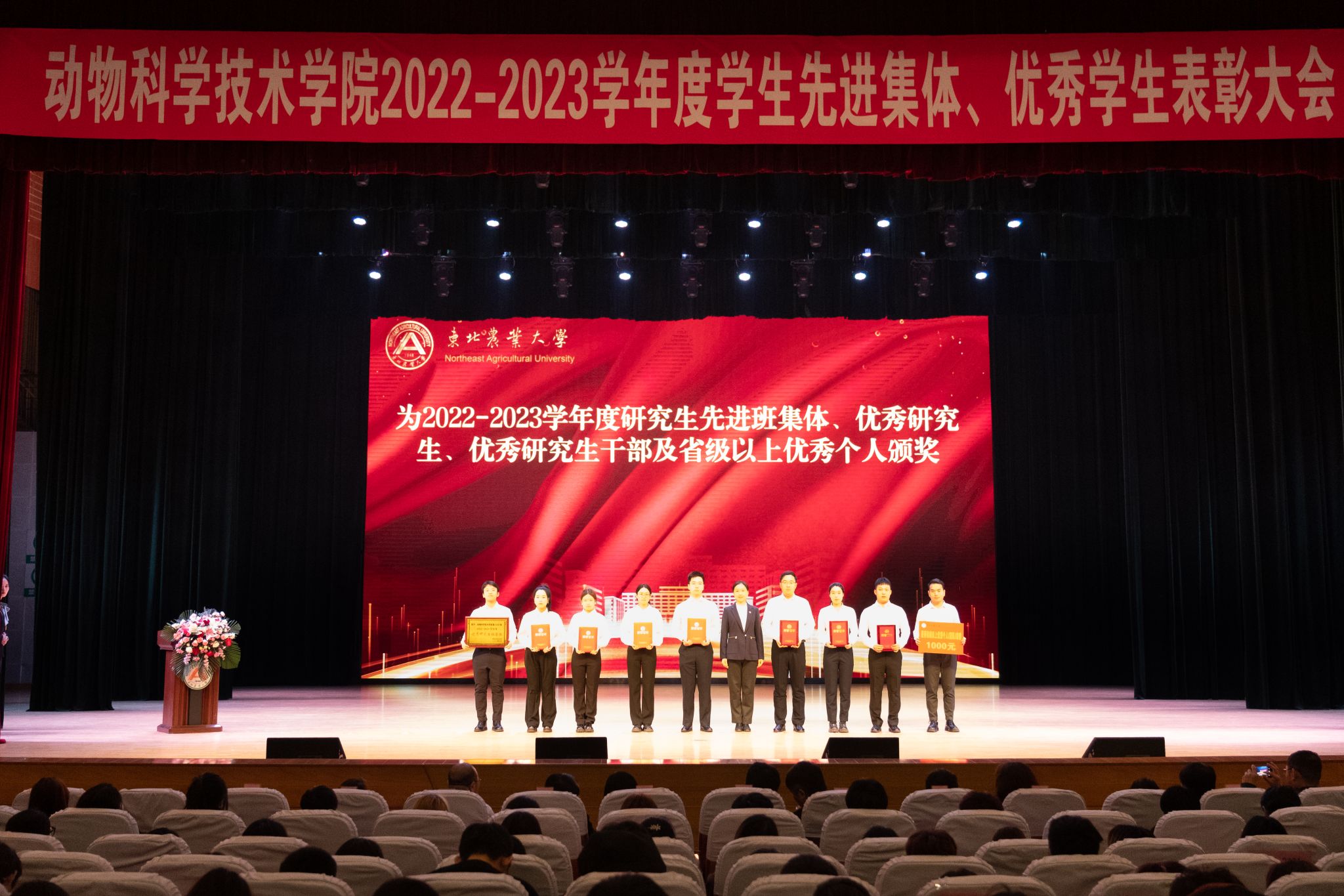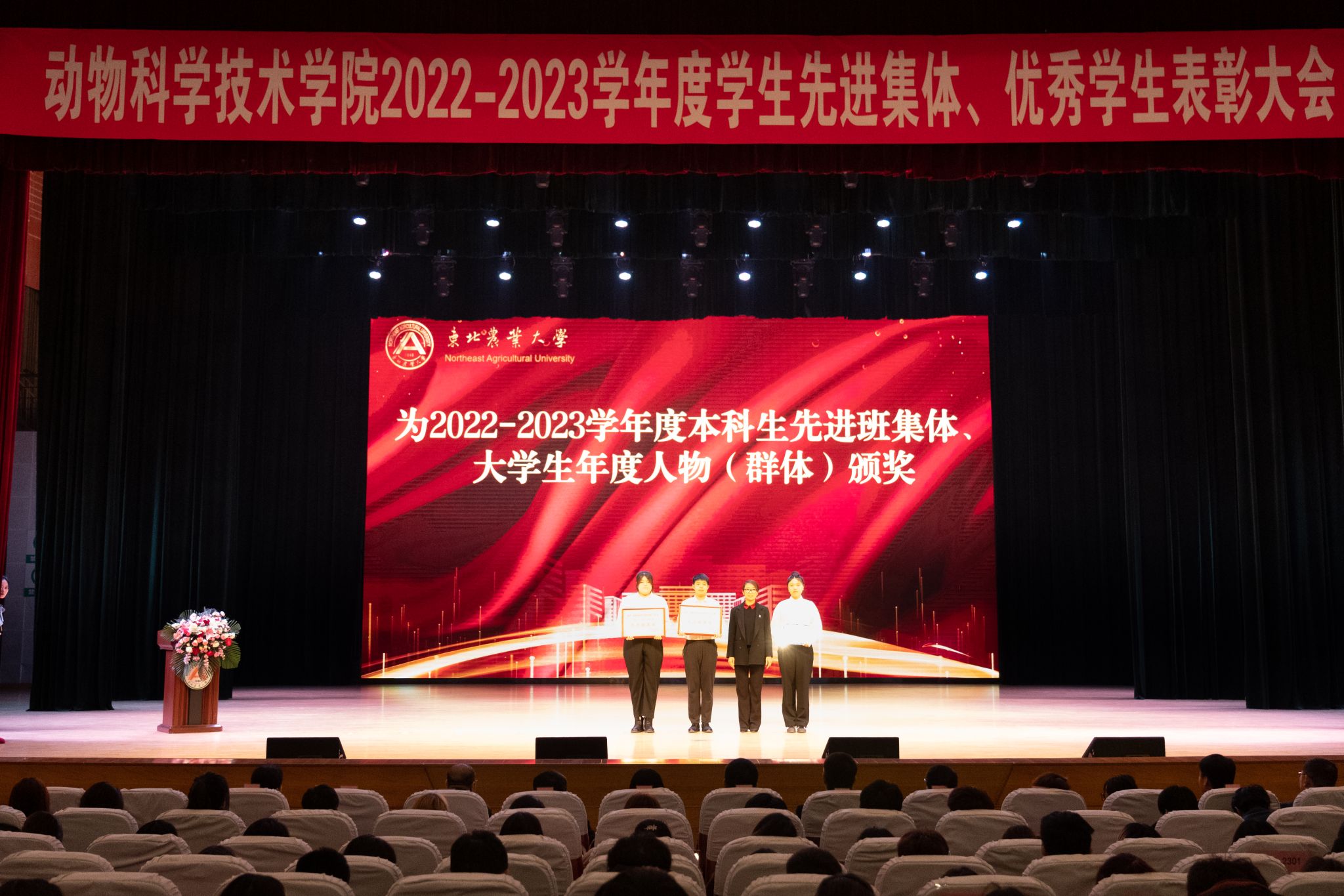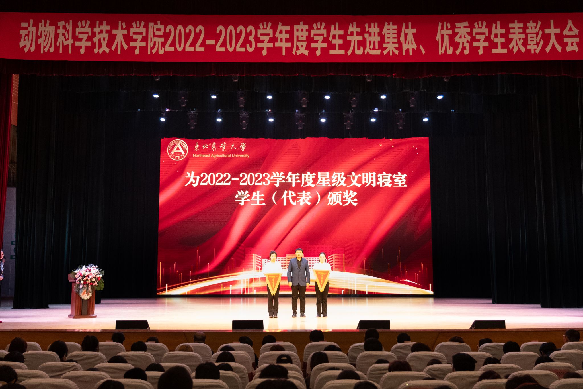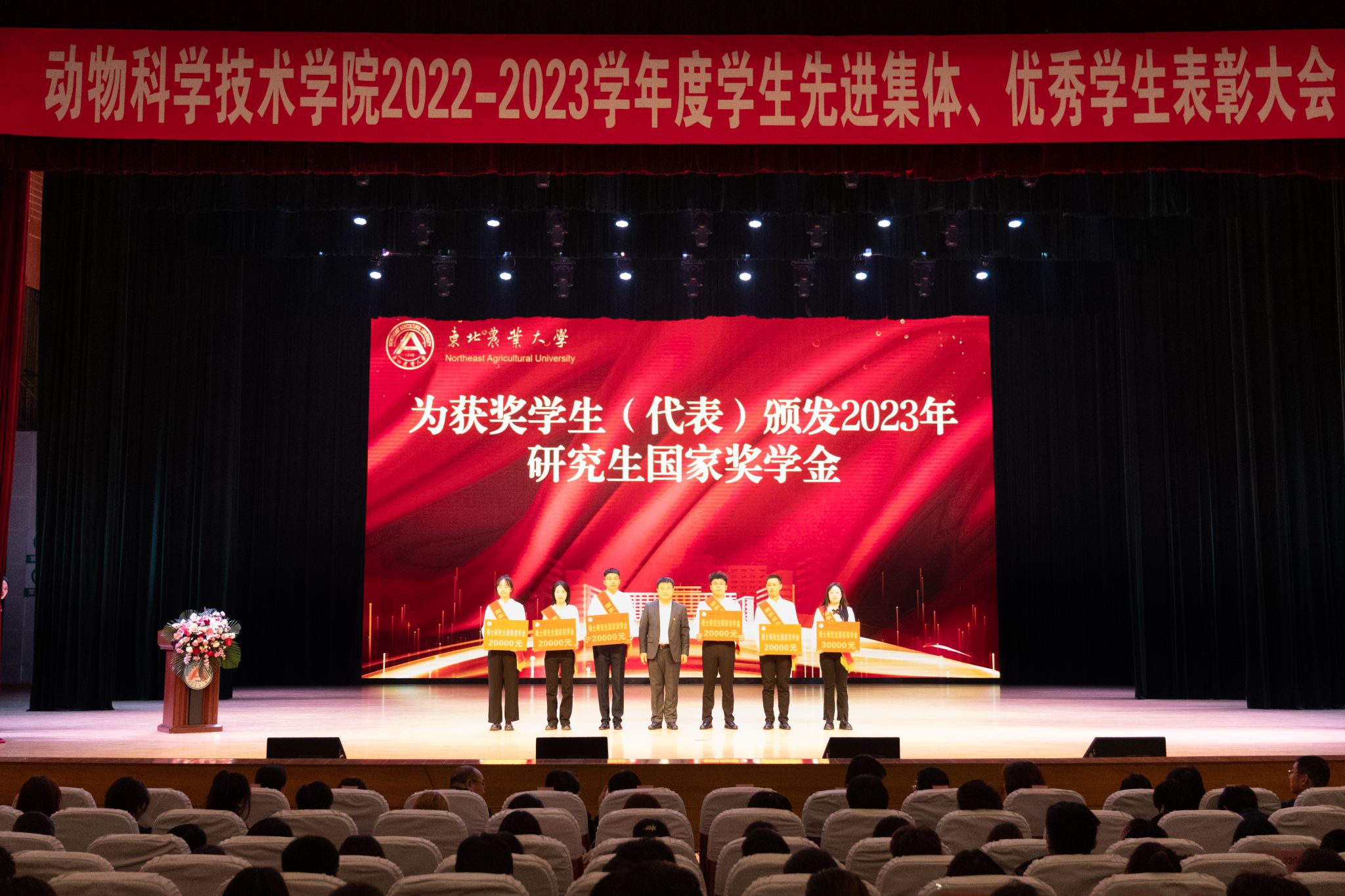 大会在庄严的国歌声中拉开帷幕。会上,与会领导分别宣读了《关于颁发 2022-2023学年度本科生国家奖学金、国家励志奖学金的决定》《关于颁发2023年研究生国家奖学金的决定》《关于表彰2023年黑龙江省普通高等学校“三好学生”的决定》《关于颁发2022-2023学年度本科生单项奖学金的决定》《关于表彰2022-2023学年度本科生先进班集体、大学生年度人物(群体)的决定》《关于表彰2022-2023学年度星级文明寝室的决定》《关于表彰2022-2023学年度研究生先进班集体、优秀研究生、优秀研究生干部及省级以上优秀个人的决定》《获得2022-2023学年度大北农励志奖学金名单》,共计5个先进集体,283个优秀个人获得表彰。与会领导为获奖集体和个人颁奖。