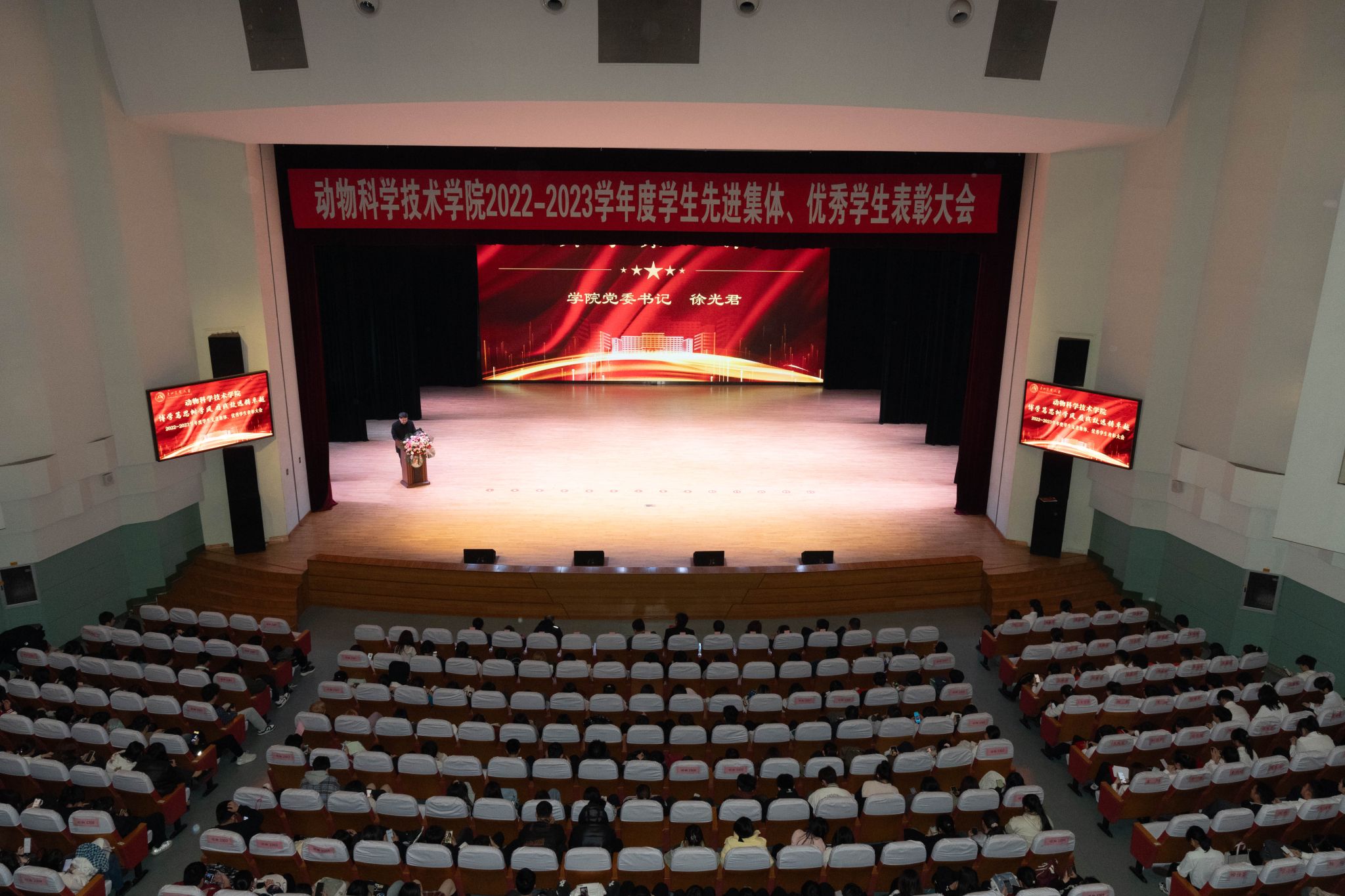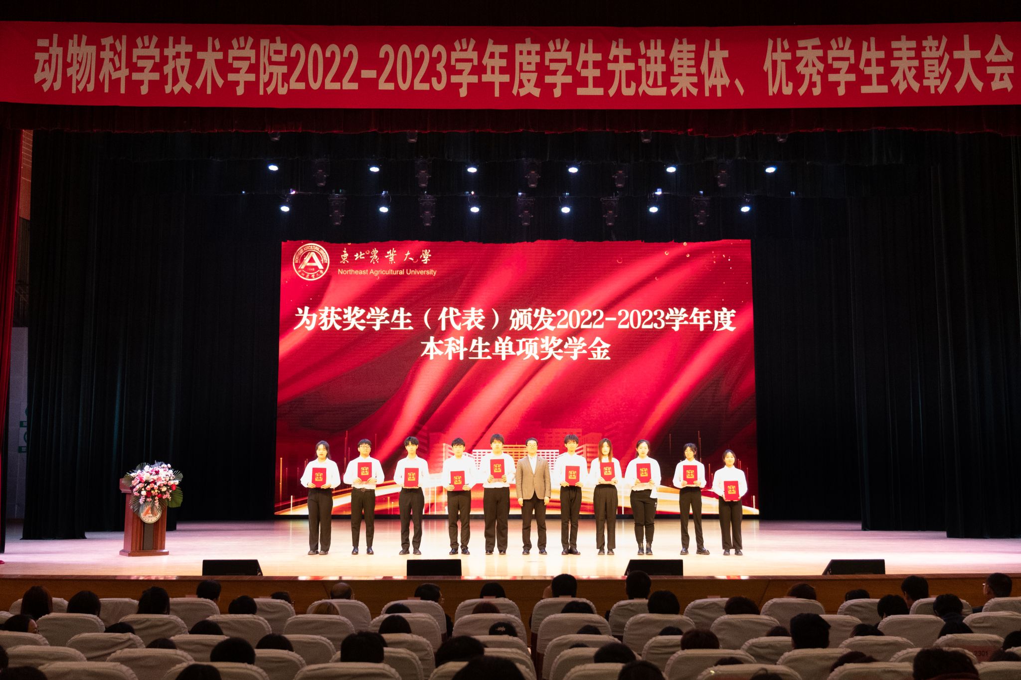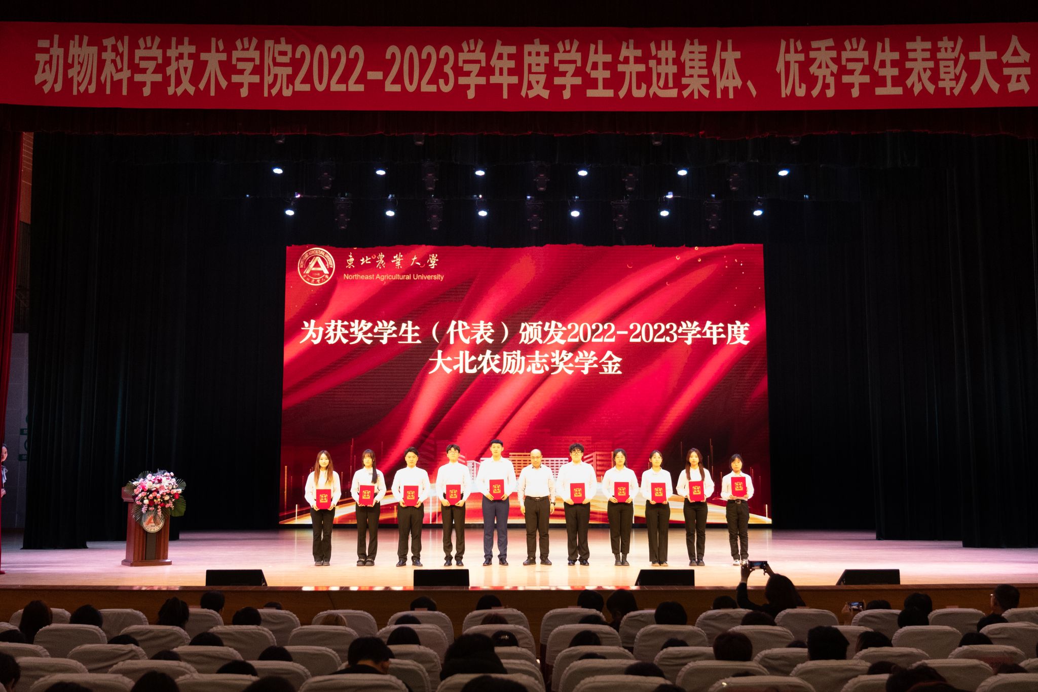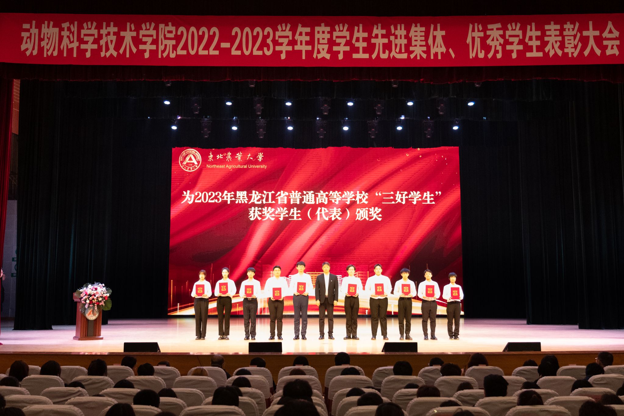 为全面贯彻落实立德树人根本任务,进一步发挥先进典型的示范引领作用,弘扬优良学风,讲好榜样故事,激发学生“当好主人翁、建功新时代”的奋斗热情,3月26日,动物科学技术学院在音乐厅隆重举行“博学笃思树学风,履践致远铸卓越”2022-2023学年度学生先进集体、优秀学生表彰大会。学校学生工作部(处)部(处)长于兴业,团委书记李卡,招生就业处处长宋跃芬,动物科学技术学院领导班子,全体辅导员级本硕博各年级共计1000余名学生参加大会。会议还特别邀请到大北农食品集团高级副总裁高安详,大北农猪饲料集团黑龙江区创业人才中心经理唐赛男,大北农食品集团创业人才中心经理王灿。大会由学院党委副书记焦阳主持。会议同步进行线上直播。