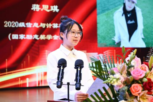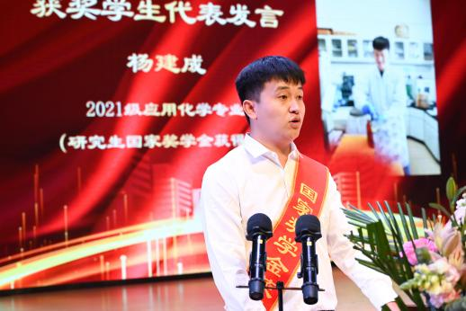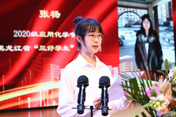 研究生国家奖学金获得者代表2021级应用化学专业杨建成,本科生国家励志奖学金获得者代表2020级信息与计算科学专业蒋思琪,黑龙江省“三好学生”获奖代表2020级应用化学专业张杨分别发言。他们结合学习生活经历,汇报了成长成才的心路历程,对学校的培养、老师同学们的支持表达了感谢,号召全体同学努力学习、全面发展,争做有理想、敢担当、能吃苦、肯奋斗的新时代好青年。